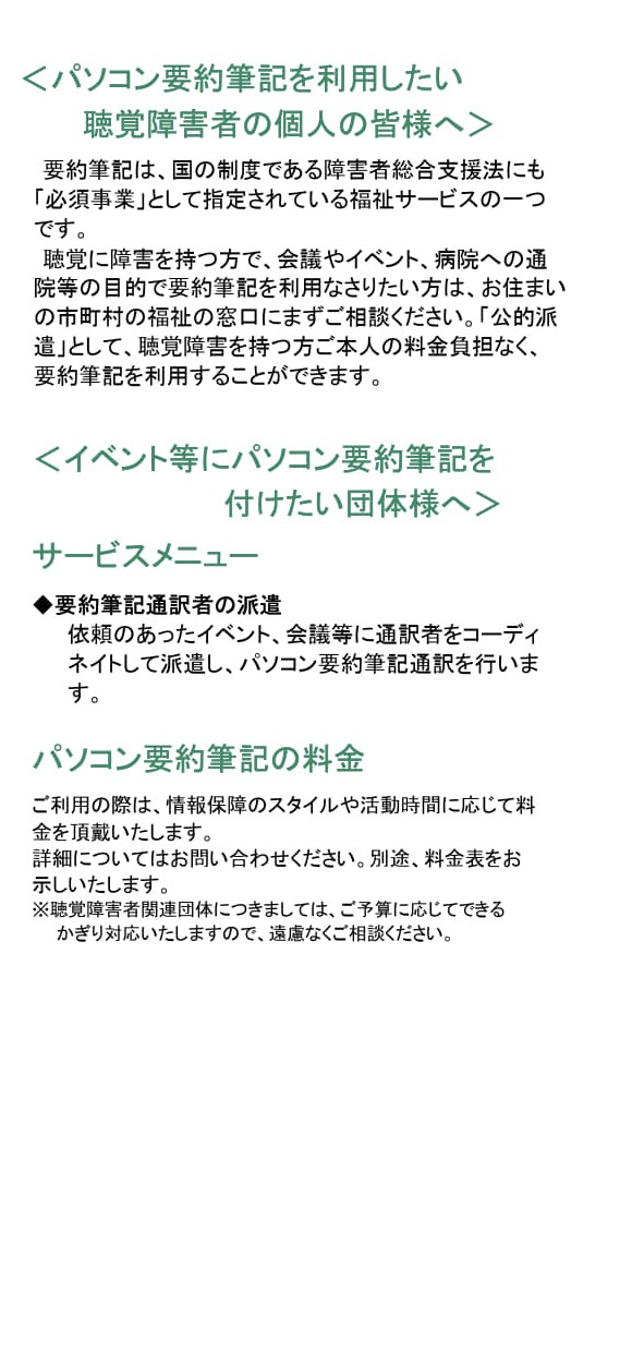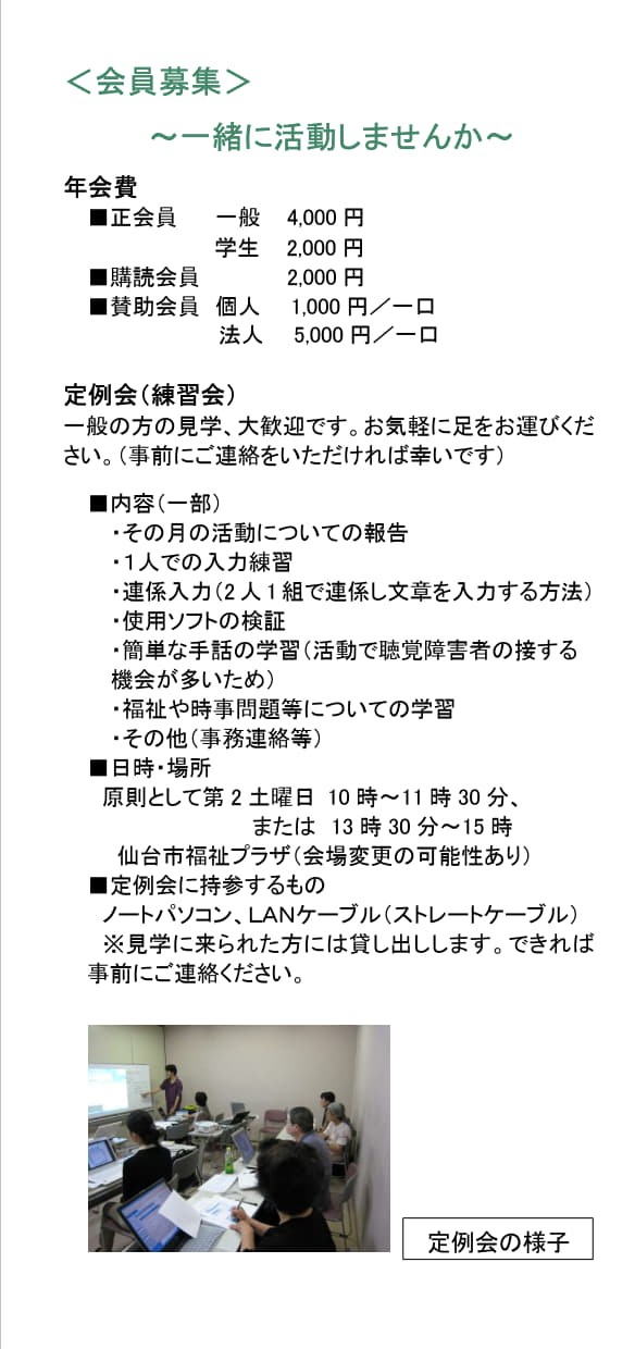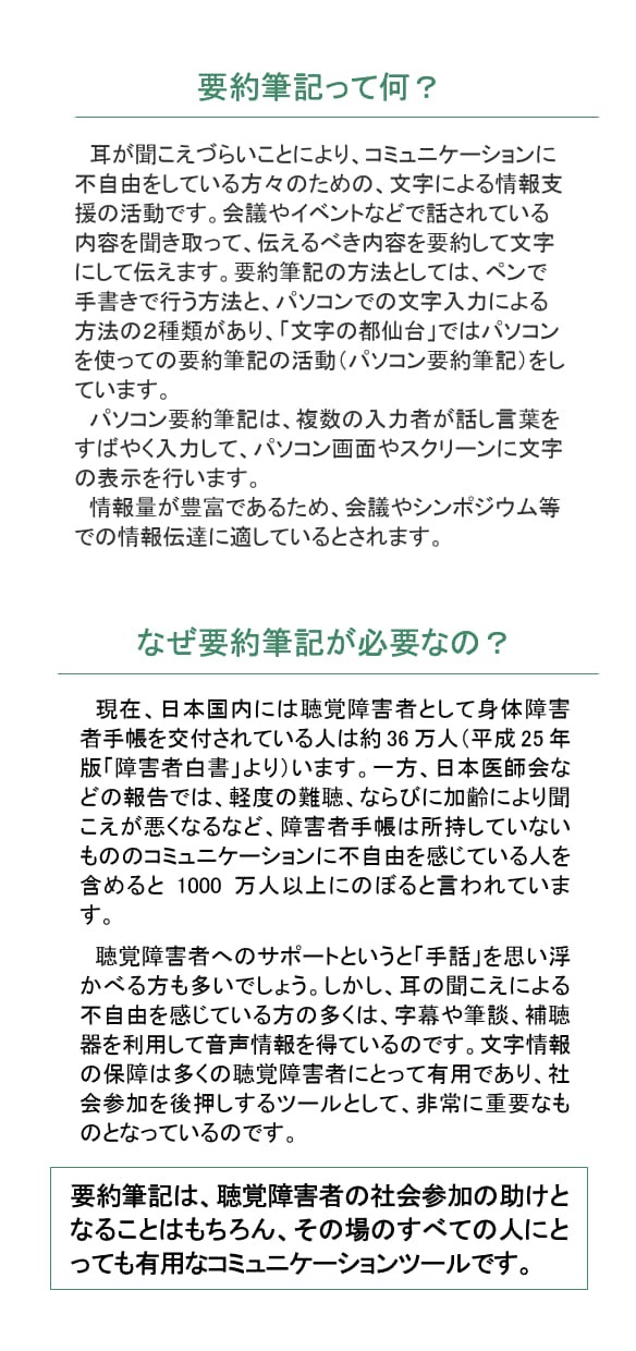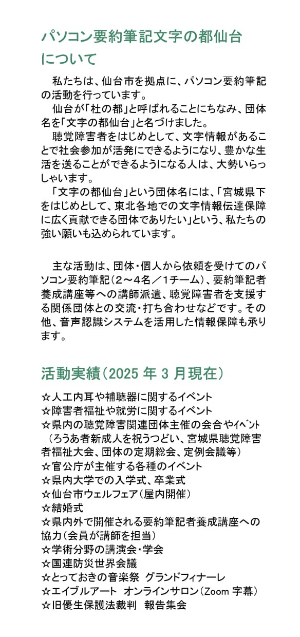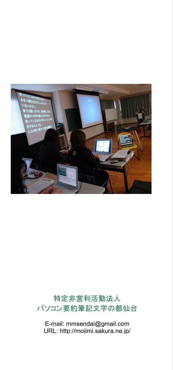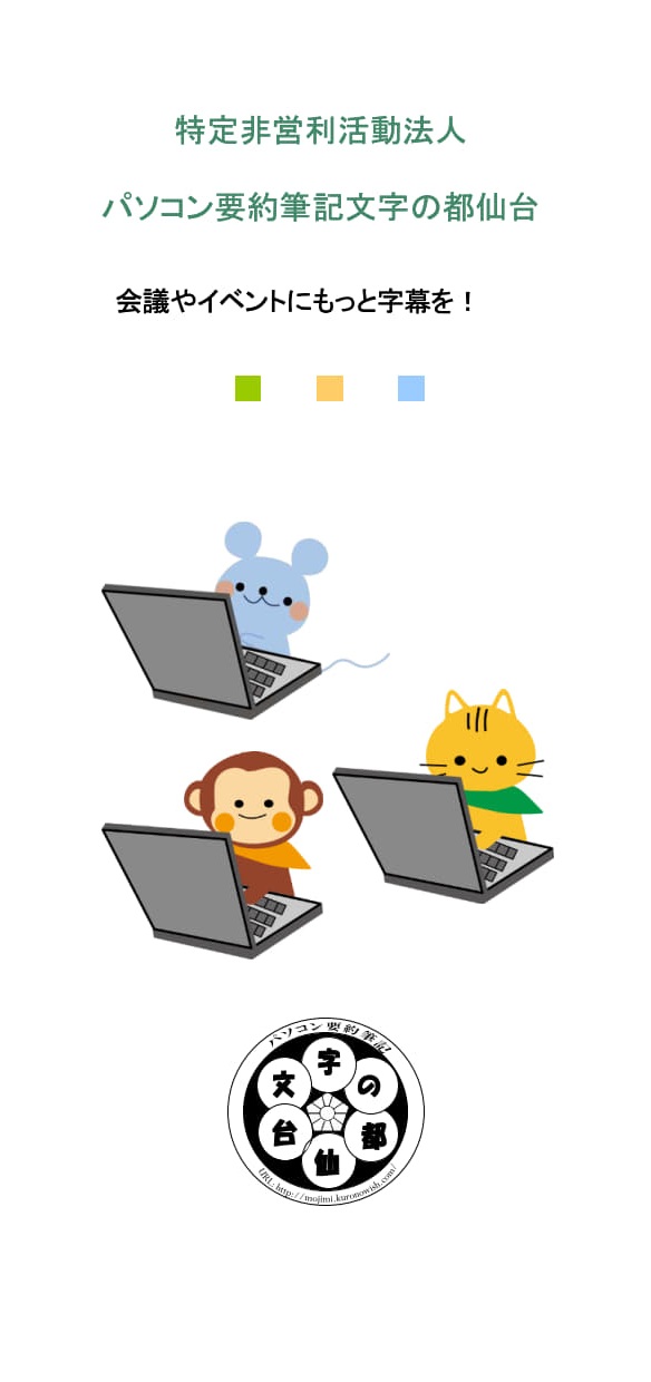 平成12年に宮城県で開催された全国身体障害者スポーツ大会での活動をきっかけに パソコン要約筆記 文字の都仙台 が設立されました。2010年3月に NPO法人となりました。